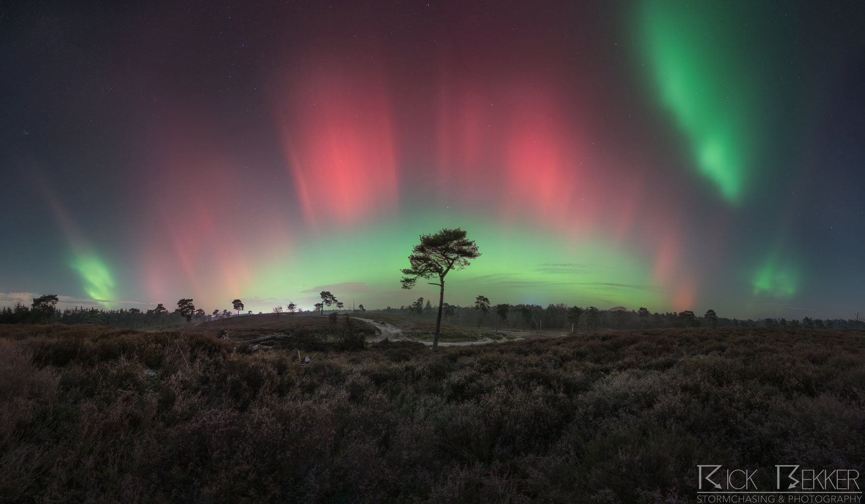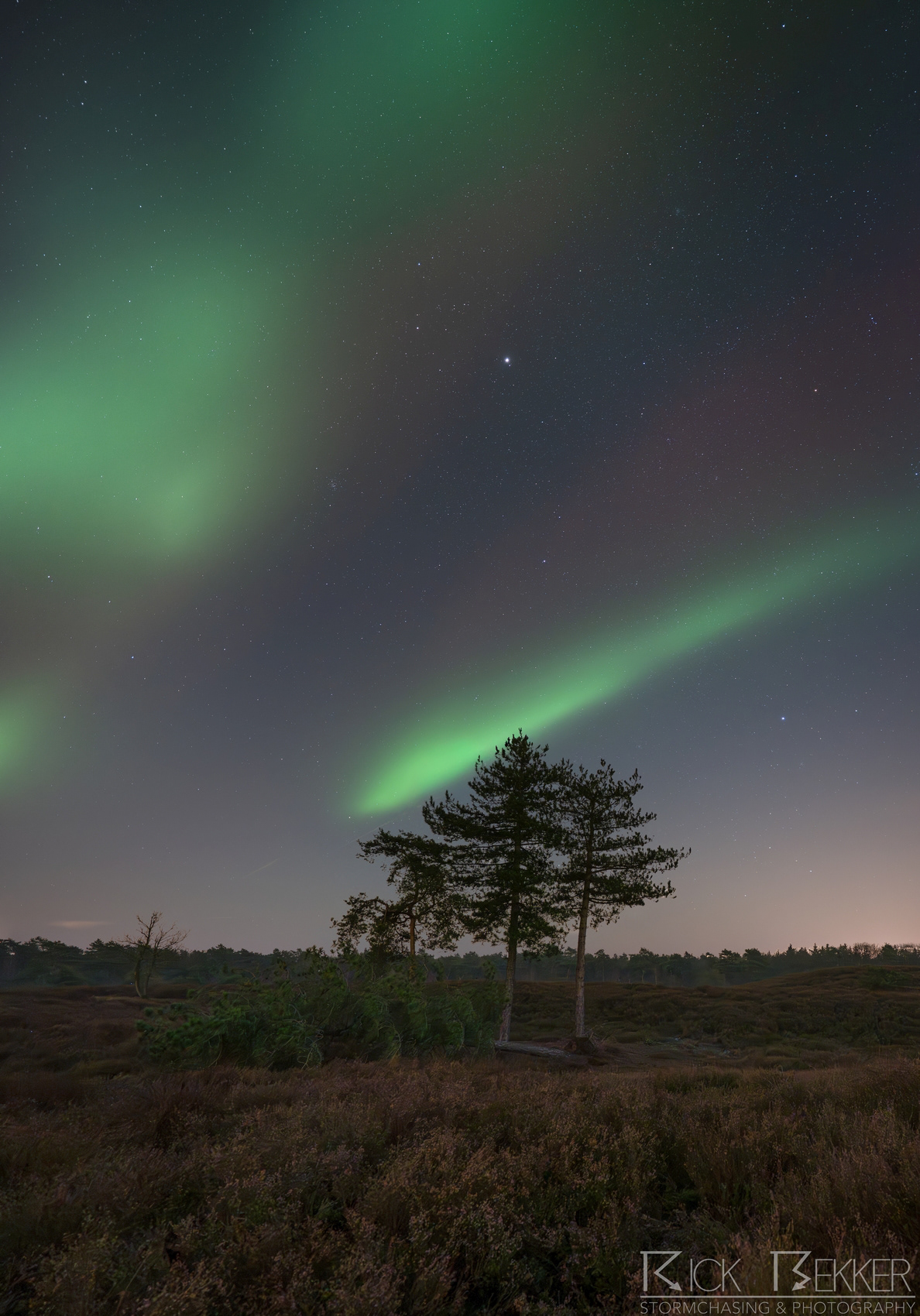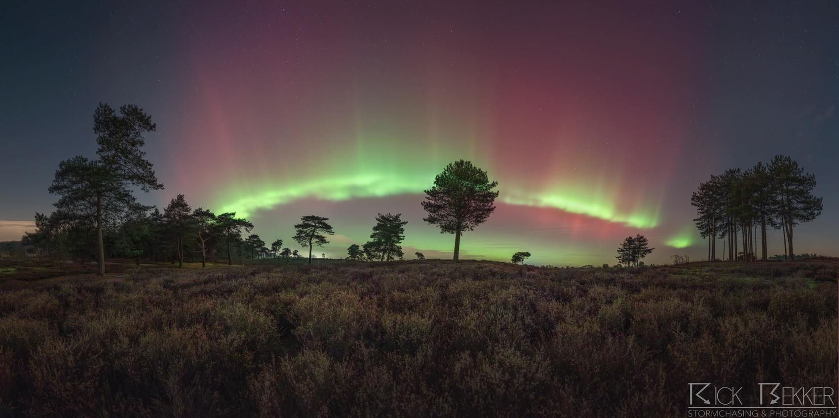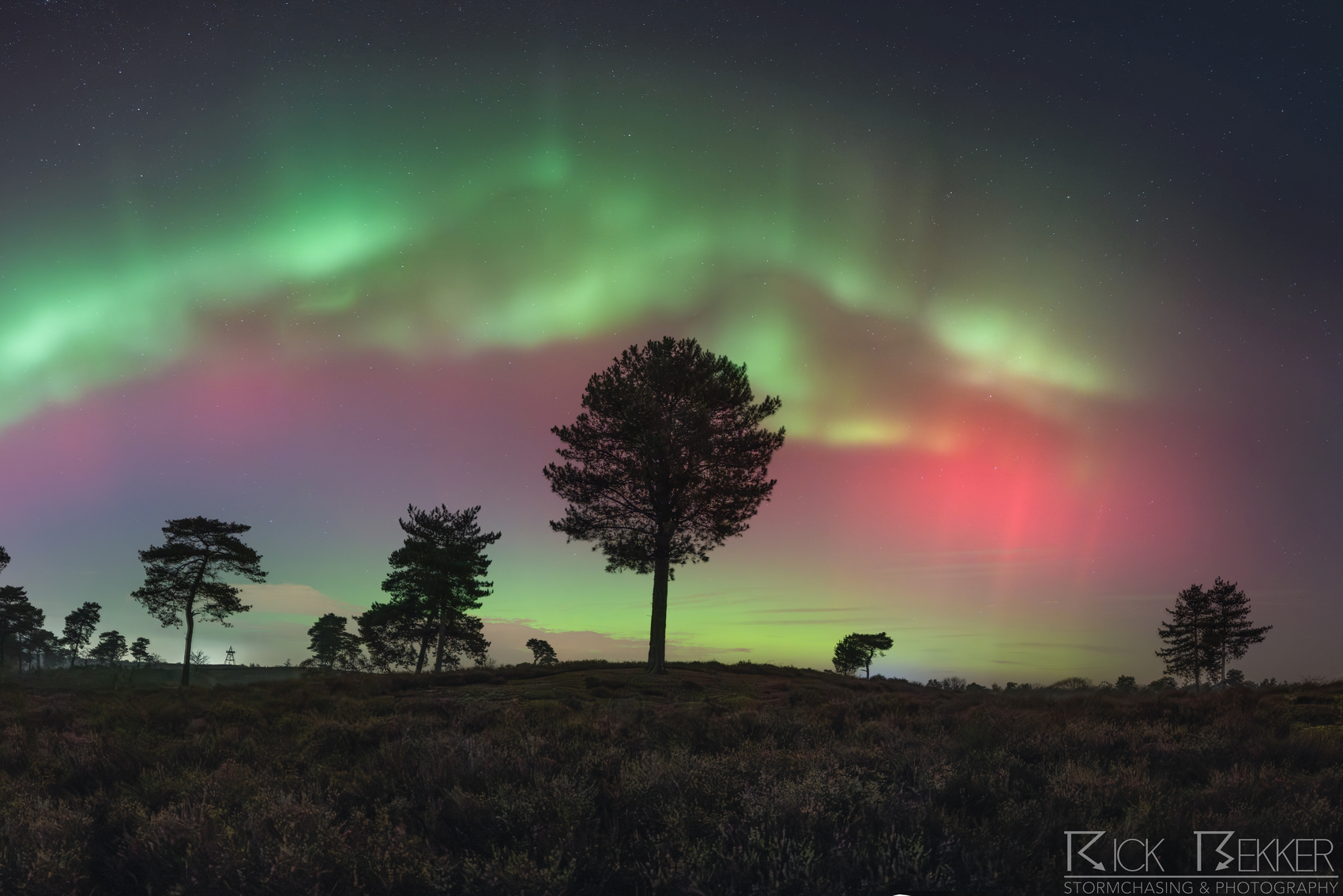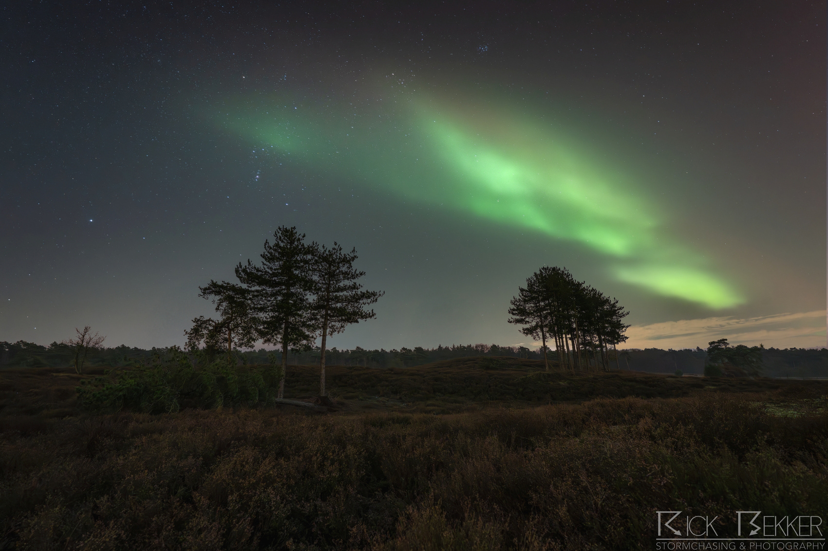 Naast de uitbreiding van het '' normale '' ovaal zien we ook zeer scherp afgetekende, groene gordijnen ruim voor de hoofdshow uit ontstaan. deze '' protonen aurora '' vormt uiteindelijk een arc van west tot oost. Zeer dynamisch spul, de groene banden zien we visueel dansen in de kraakheldere hemel.